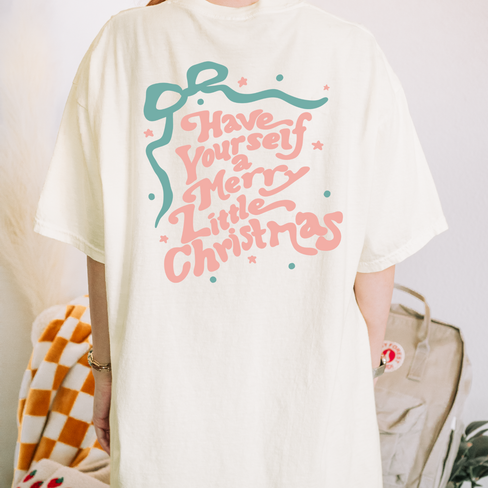 This festive tee is giving sweet, sparkly, and totally merry! Designed with soft pinks, cheerful teals, and the cutest little Christmas bow — it’s your go-to holiday outfit for cookie baking, gift wrapping, and Hallmark movie marathons.