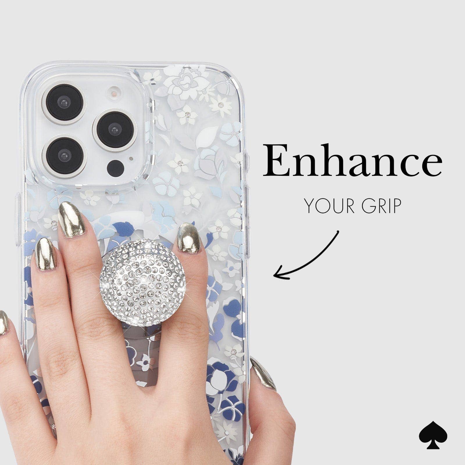Add a touch of sparkle to your everyday with the kate spade new york Signature Grip and Stand. Pop it on for a secure grip or stand and pop it off for wireless charging. Designed to make texting, scrolling, and snapping pics effortless—with a touch of genuine pavé crystals for a shimmering finish.