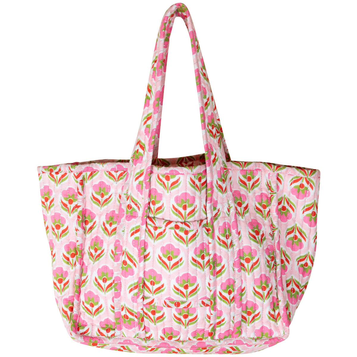 This fun block print tote bag is perfect for carrying around your essentials. With a charming blend of tradition and sparkle, this little purse is perfect for mom or your little one! Interior and exterior pockets. Bag measures 10" wide x 8" tall x 4" deep.
