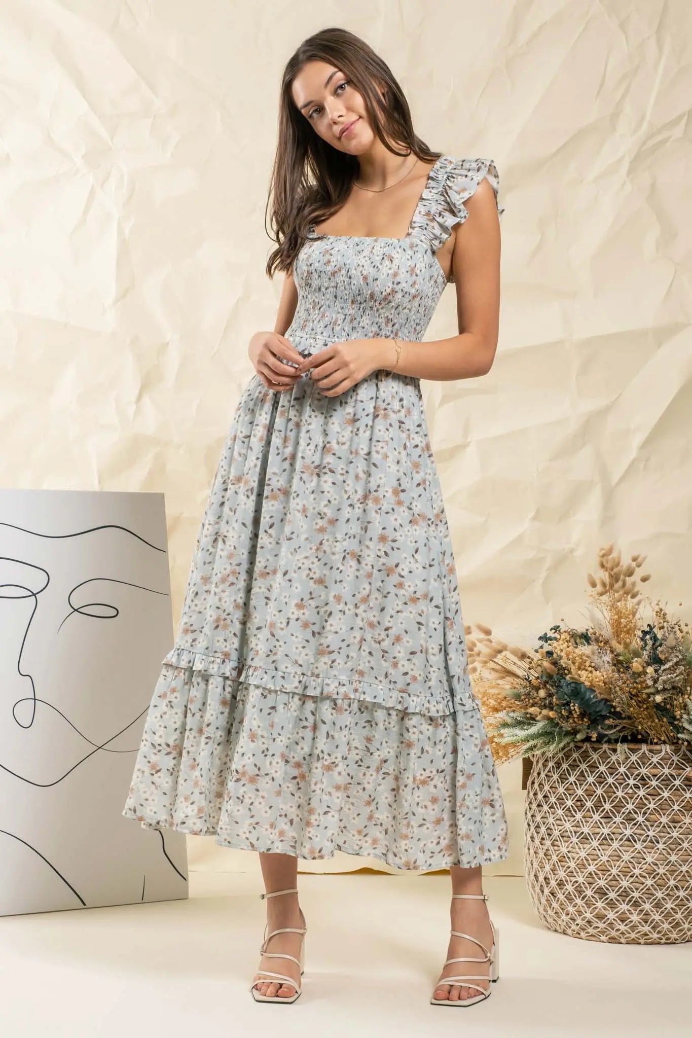 A gorgeous and delicate floral dress that you will feel like you're blooming all year long! This beauty features a mint color body with mini floral prints all over, a smocking top chest area for easy wear, sleeveless with stretchy shoulder straps being adorned by ruffles detail, front and back square neckline, a midi length with ruffle detail on the bottom, fully lined, material has plenty stretch. Wear it with wedges or sandals, or with ankle boots and a denim jacket for the cooler nights! Model wears size Small L: 49" B: 30" W: 26"