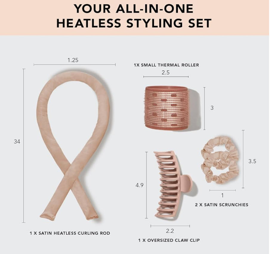 This 5 piece gift set includes a satin heatless hair curler, 2 scrunchies, a ceramic thermal roller & claw clip. The perfect gift or to just treat yourself to effortless curls!
