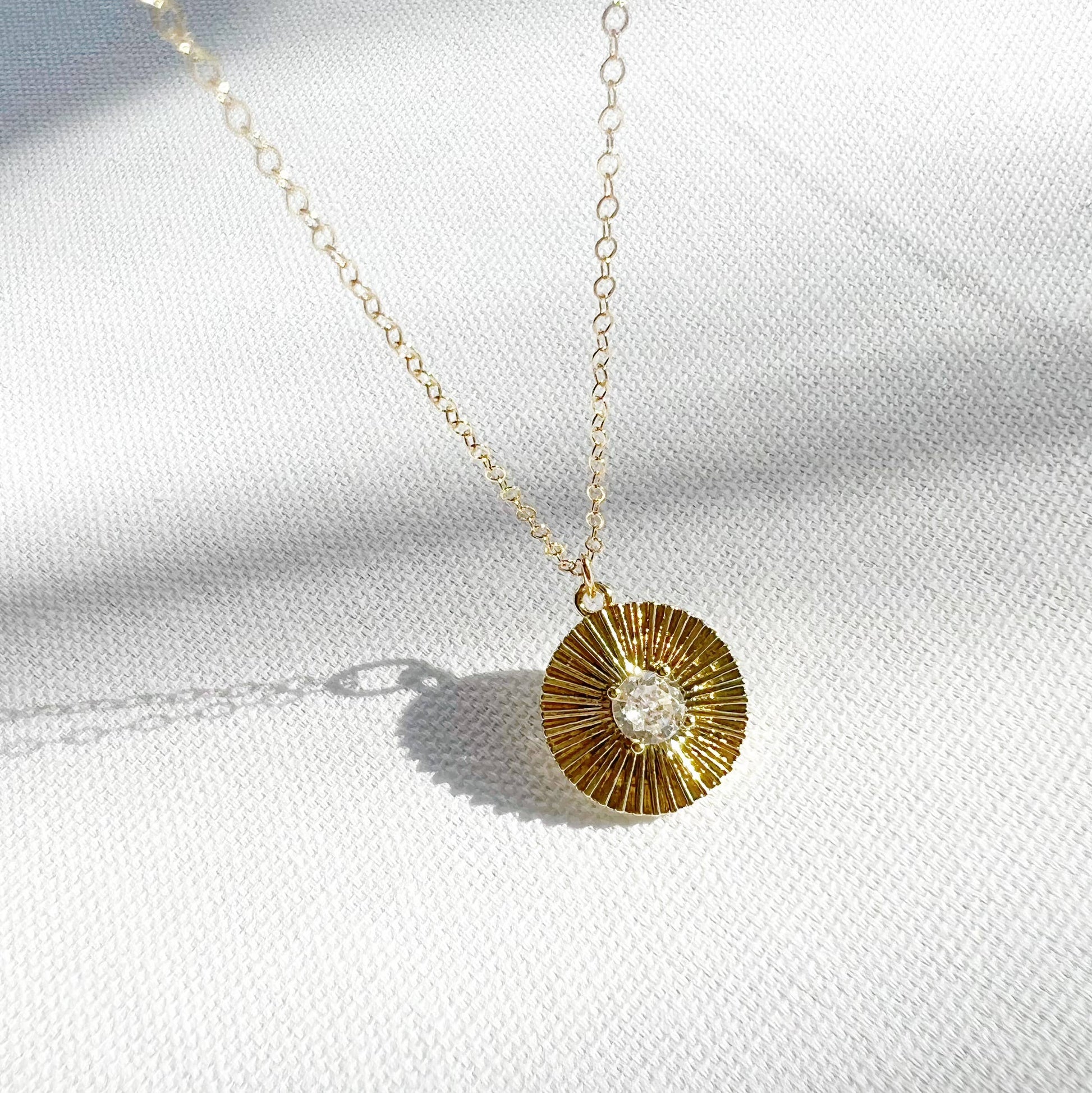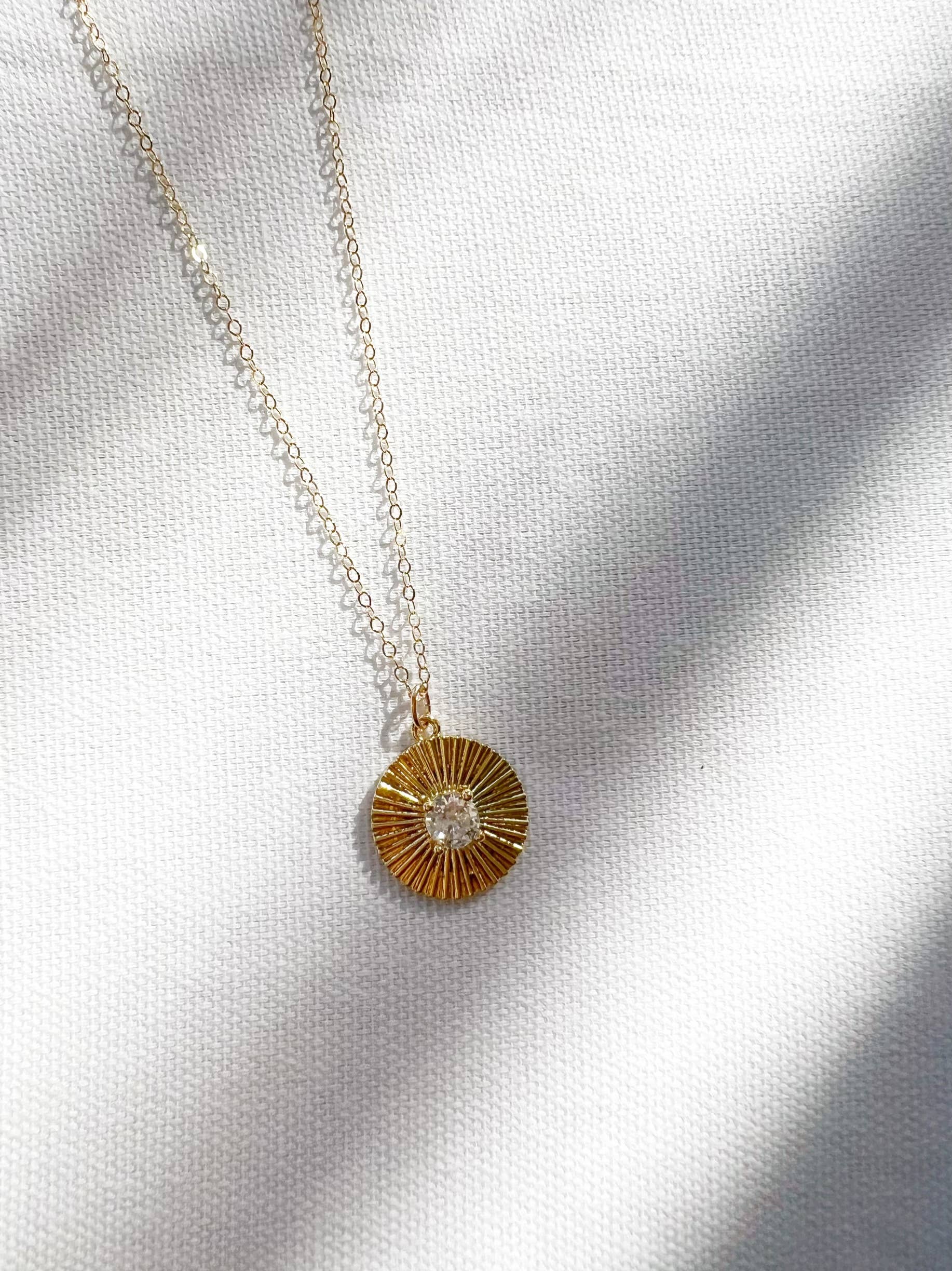 Gold filled sunburst pendant strung on our signature 14k gold filled dainty cable chain.